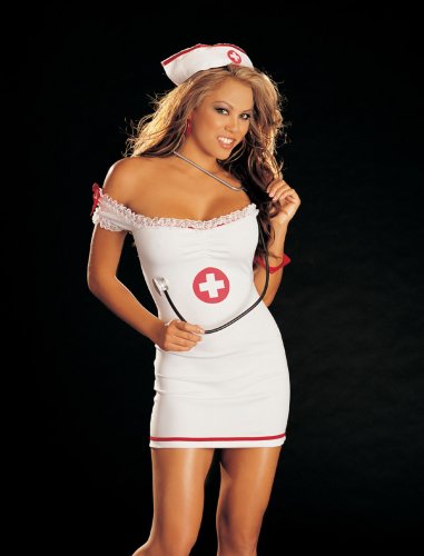 Very Cute 3 PC Nurse Costume Set ~ Risque Collection. (R-6832) Very Cute 3 PC Nurse Costume Set includes stretch knit Dress, Cap, and Stethoscope. ~ Risque Collection. Colors: : White. Sizes: One Size .